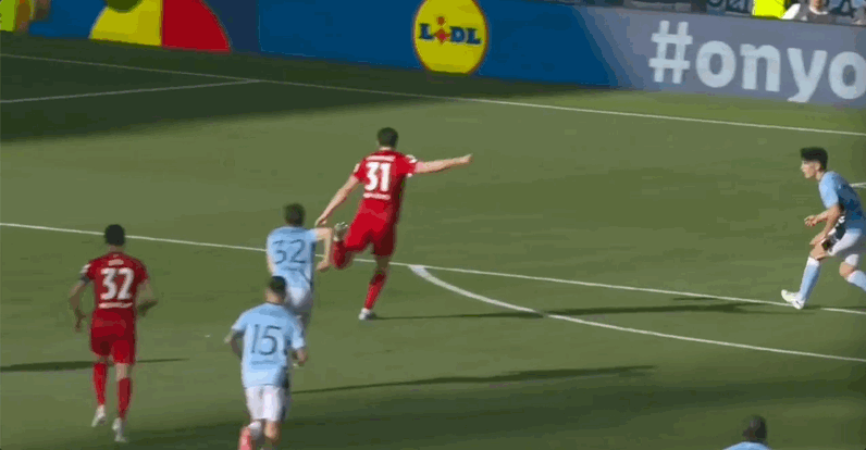 25’贝西诺无球状态直接推倒弗赖堡球员,主裁判果断吹罚犯规