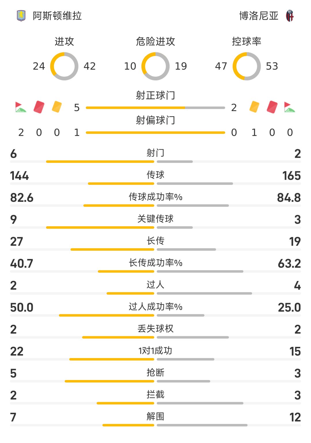 25/26赛季欧联1/4决赛次回合,阿斯顿维拉迎战博洛尼亚。上半场,贝尔纳代斯基远射被门将没收,罗杰斯助攻沃特金斯推射破门,随后迪涅传中造点,罗杰斯主罚点球被门将扑出,仅过了一分钟,迪涅助攻布恩迪亚小角度推射建功,半场结束前,罗杰斯抽射扩大比分,半场战罢,阿斯顿维拉3-0领先博洛尼亚。