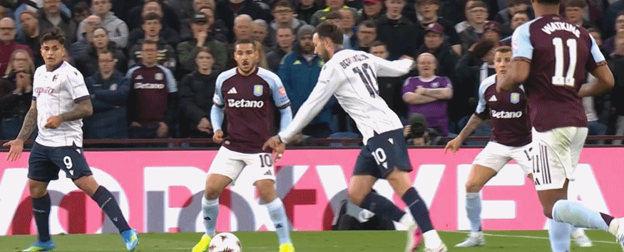 26’迪涅边线球直接发向对方禁区,布恩迪亚小角度推射破门!维拉2-0博洛尼亚