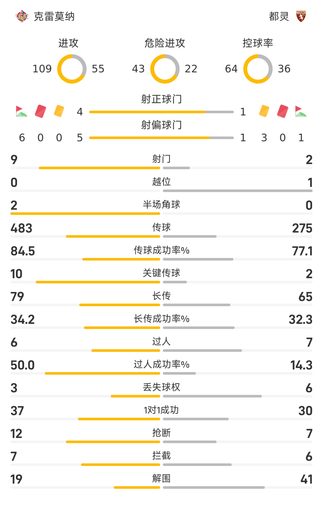 25/26赛季意甲联赛第33轮,克雷莫纳0-0互交白卷闷平都灵。