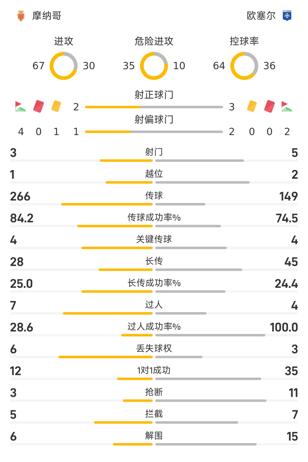 25/26赛季法甲联赛第30轮,摩纳哥迎战欧塞尔。半场战罢,双方比分暂为摩纳哥0-2欧塞尔,达诺伊斯、希纳约科破门建功。