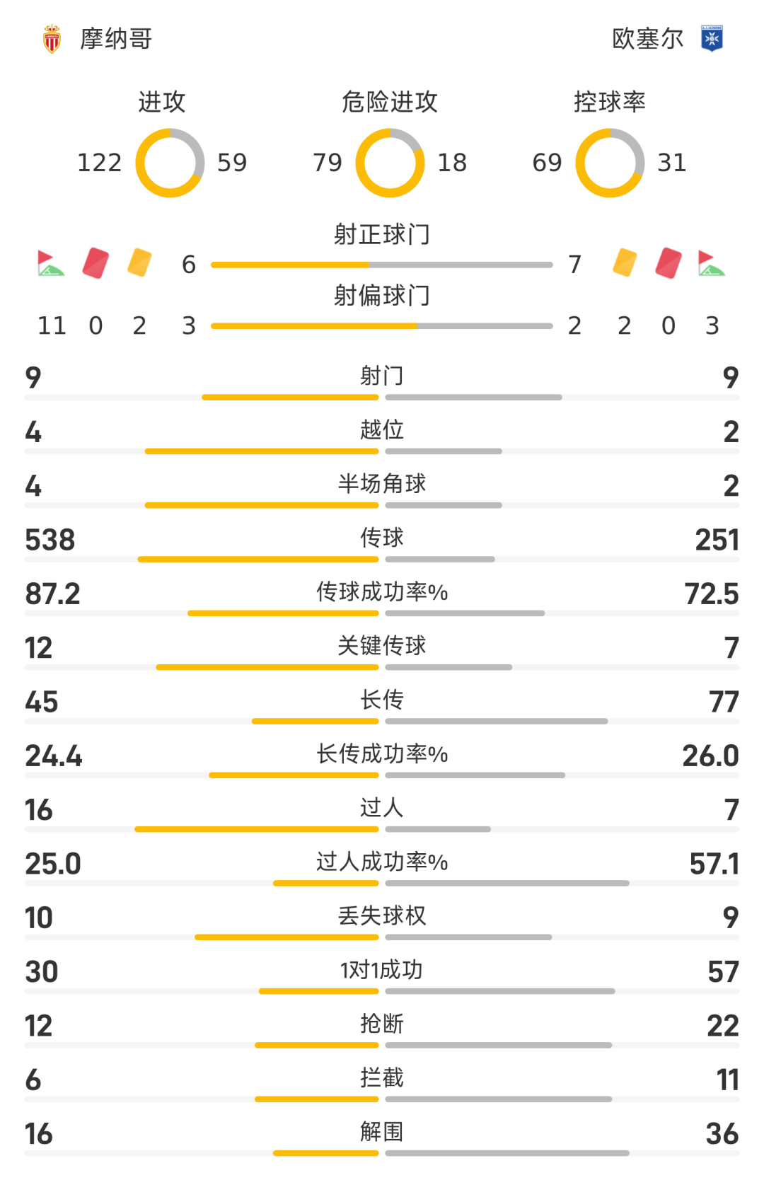 25/26赛季法甲联赛第30轮,摩纳哥2-2战平欧塞尔。全场比赛,巴洛贡、法蒂、达诺伊斯、希纳约科破门建功。