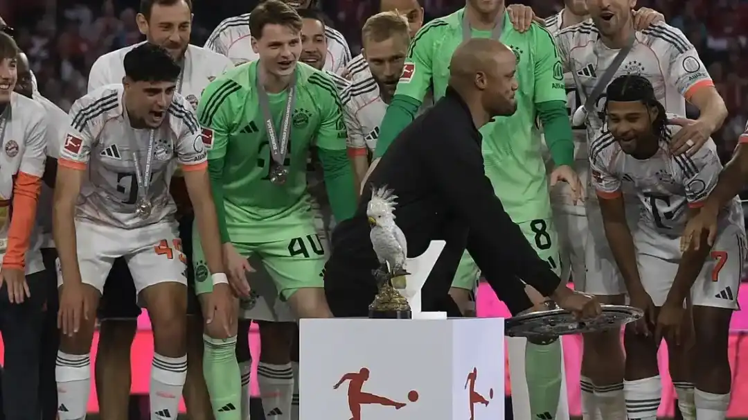 而之后,这个鹦鹉雕塑更是直接出现在了拜仁的夺冠庆典上。在拜仁全队举起沙拉盘时,这个鹦鹉雕塑便被放在沙拉盘底座上。