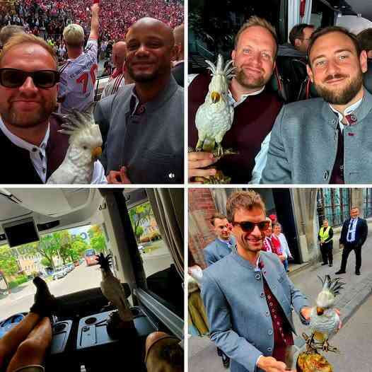 在之后拜仁举行的夺冠游行中,这个鹦鹉雕塑再次亮相。