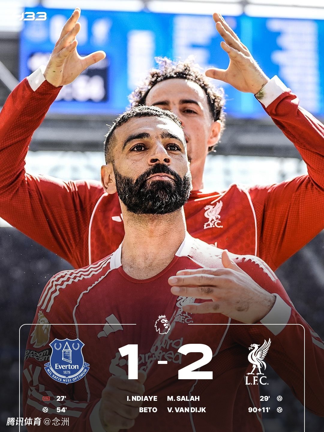 利物浦客场2-1击败埃弗顿,取得两连胜,积55分仍居第5。恩迪亚耶破门无效,加克波助攻萨拉赫推射首开纪录,贝托推射扳平比分,马马尔达什维利伤退,索博助攻范戴克头球第100分钟读秒绝杀。