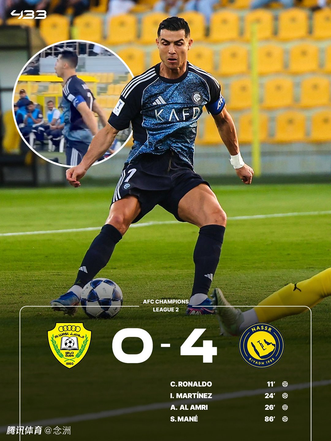 亚冠二级联赛1/4决赛,利雅得胜利客场4-0迪拜祈祷,晋级四强。C罗推射破门,打入职业生涯第969球,菲利克斯双响,伊尼戈-马丁内斯、阿姆里破门,马内锦上添花。