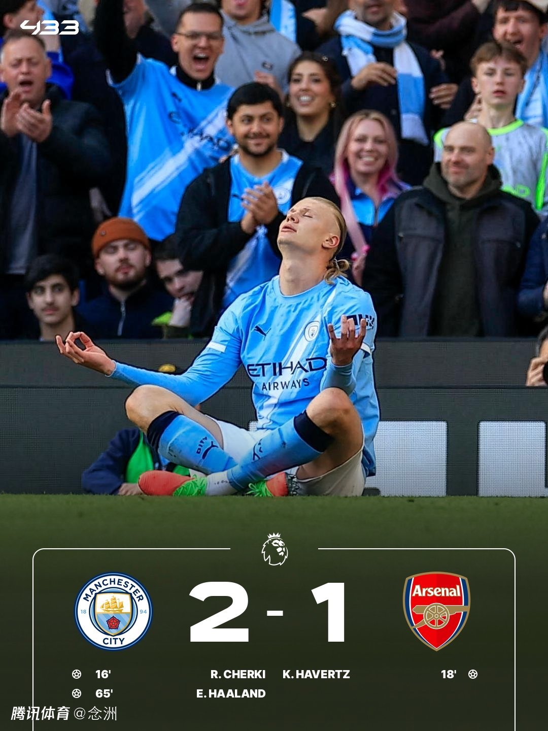 英超第33轮天王山之战,曼城主场2-1战胜阿森纳,少赛1场积67分仍居第2,落后阿森纳只有3分。枪手积70分位居榜首。谢尔基一条龙首开纪录,多纳鲁马超巨失误送礼,哈弗茨扳平比分,哈兰德破门,埃泽和加布里埃尔中柱,罗德里伤退。