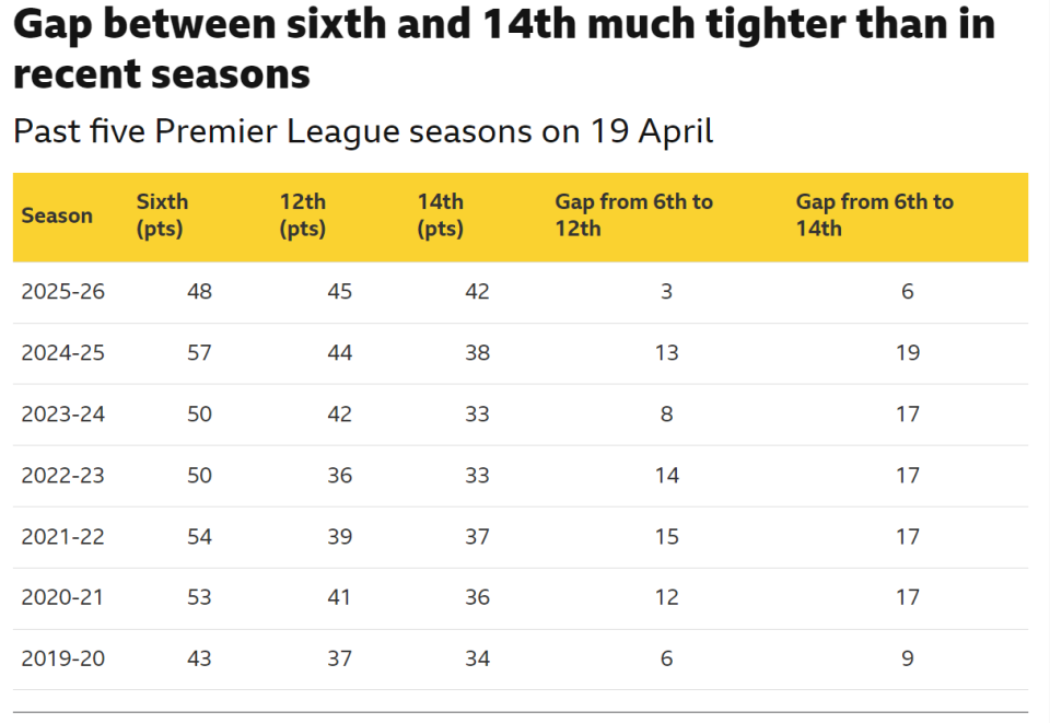 去年同期,英超第六名和第14名已经有多达19分的分差,更早之前的三个赛季,则都是17分。在英超创立后的34个赛季中,4月19日时排名联赛第六的球队与排名第12的球队之间的平均分差为13.3分;排名第六的球队与排名第14的球队之间的平均分差则为16.5分。