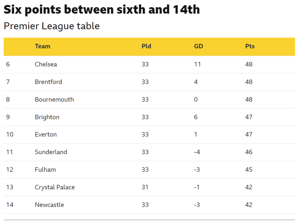 不过,这个赛季英超中游竞争激烈,第六名切尔西和第14名纽卡斯尔联之间只有6分差距。切尔西最近6场输了5场,积48分与布伦特福德和伯恩茅斯相同。数据显示,这确实是历年来积分榜中游缠斗最激烈的一年!