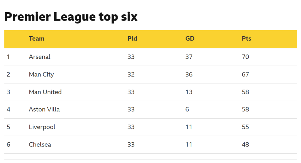 曼联和维拉都领先切尔西10分之多,接下来的5场比赛里,只要拿到6分就能确保欧冠资格。