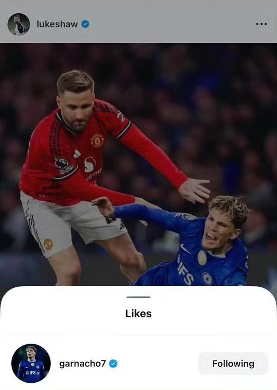有趣的是,加纳乔本人竟也点赞了这张图片!联想到他最近删除社媒的切尔西内容,只留下两个与曼联有关的视频,斯坦福桥怀疑他的红魔内应也可以理解。