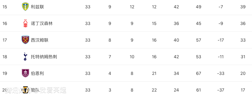 剩余1个降级席位,将在4队之中产生。第15名(利兹联)、第16名(森林)、第17名(西汉姆)之间各差3分,这三队的保级形势较为乐观。
