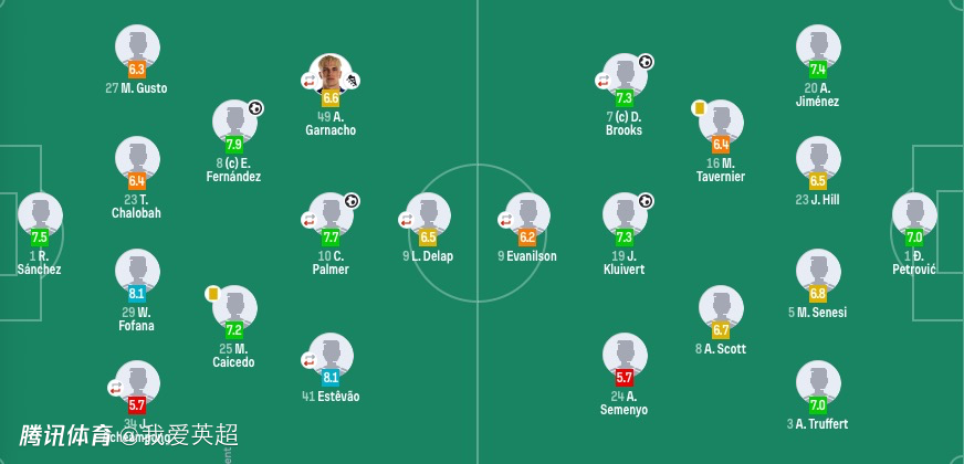 切尔西首发:1-桑切斯、34-乔什·阿昌庞(46'24-詹姆斯)、23-查洛巴、27-古斯托、29-福法纳、25-凯塞多、8-恩佐、41-埃斯特旺(92'11-吉滕斯)、10-帕尔默(63'20-若昂·佩德罗)、49-加纳乔(46'7-内托)、9-德拉普(87'17-桑托斯)