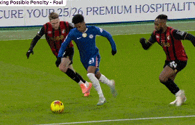 第10分钟,埃斯特旺带球突入禁区,被塞门约推倒在地,主裁没有表示,随后VAR介入,主裁到场边观看视频回放,判给切尔西点球,帕尔默主罚命中,切尔西扳平。