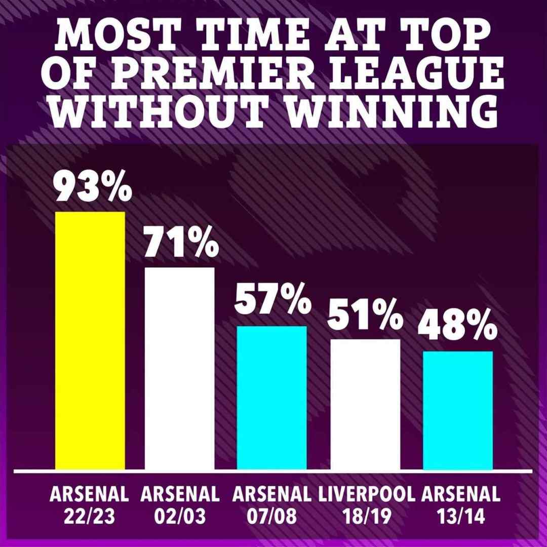 在这个赛季,阿森纳长期处于领跑位置,据统计,这个赛季阿森纳处在联赛榜首的时间高达93%,不少球迷都以为阿森纳终结联赛冠军荒或许就在今年。