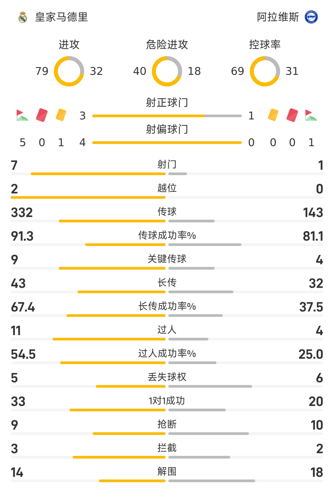 25/26赛季西甲联赛第33轮,皇家马德里迎战阿拉维斯。半场战罢,双方比分暂为皇家马德里1-0阿拉维斯,姆巴佩破门建功。
