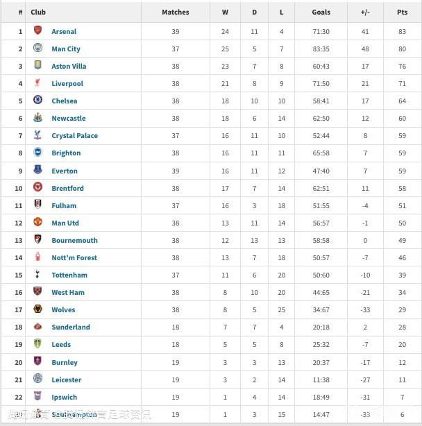 在39场比赛中,阿森纳取得24胜11平4负,成为全年积分最高的球队。曼城以80分紧随其后,尽管场次略少,但依然保持着强劲竞争力。阿斯顿维拉凭借出色发挥以76分排名第三,利物浦则以71分位列第四。