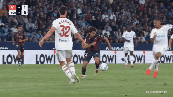 38’打破僵局!罗梅罗小角度撩射破门,莱万特1-0塞维利亚