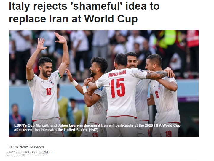 负责意大利所有体育事务的意大利奥委会主席卢西亚诺・邦菲利奥也拒绝顶替伊朗的想法,“我会感到被冒犯,你必须配得上参加世界杯。”