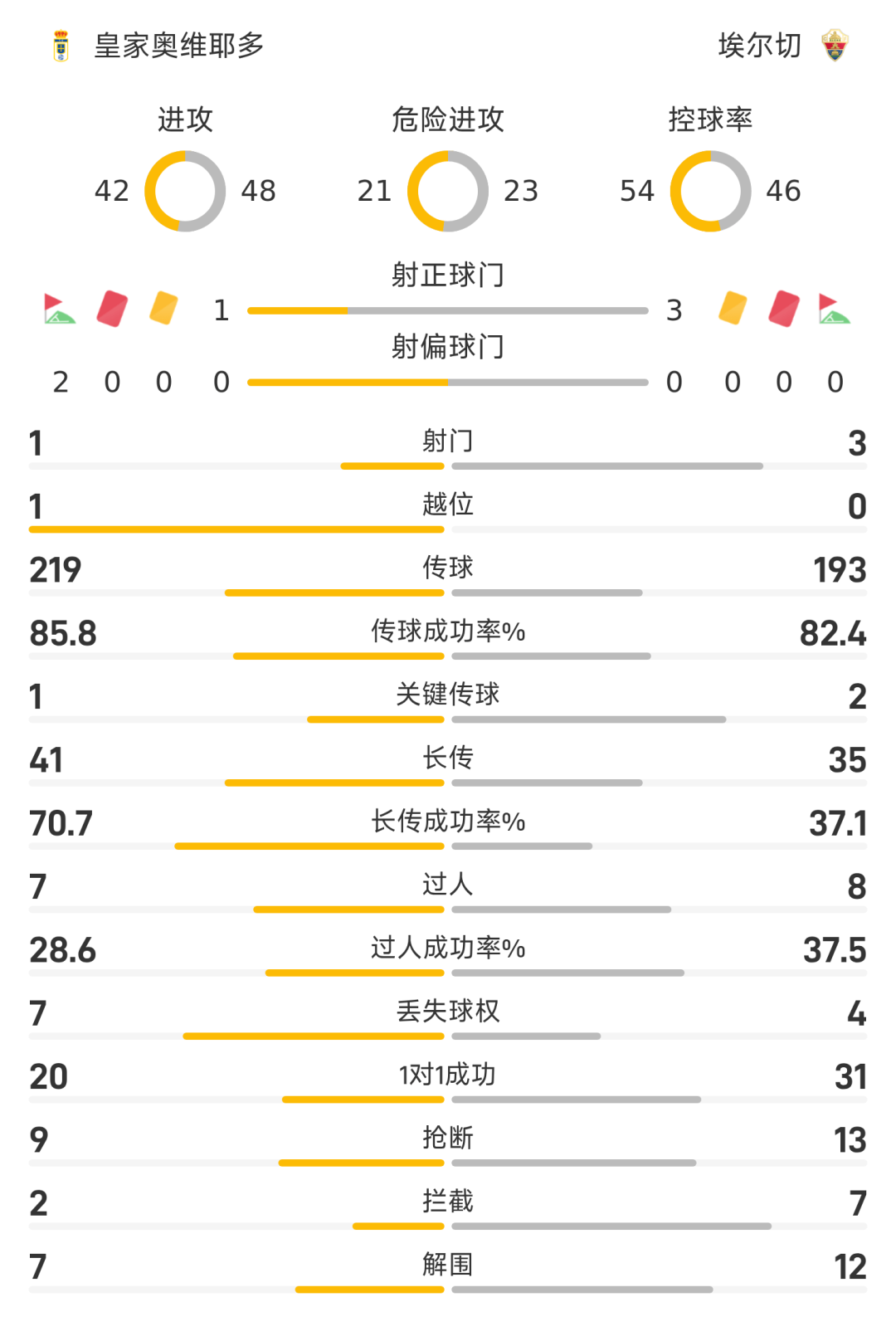 25/26赛季西甲联赛第32轮,皇家奥维耶多迎战埃尔切。半场战罢,双方比分暂为皇家奥维耶多0-2埃尔切,比利亚尔、比加斯破门建功。