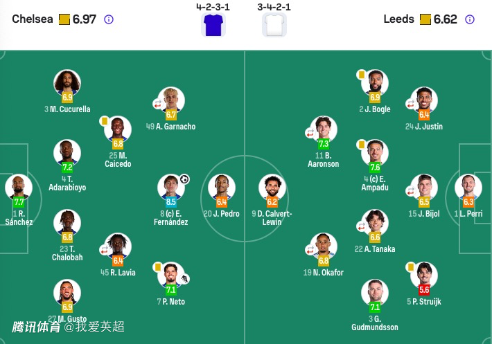 利兹联首发:1-佩利、2-杰登·博格、3-古德蒙德森、5-斯特鲁伊克、15-比约尔、9-勒温