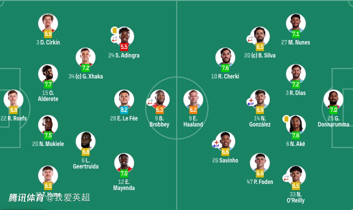 曼城首发:25-多纳鲁马、27-努内斯、3-鲁本·迪亚斯、6-阿克、33-奥赖利、14-尼科·冈萨雷斯(46'16-罗德里)、20-B席(85'4-赖因德斯)、26-萨维尼奥(51'11-多库)、47-福登、10-谢尔基、9-哈兰德