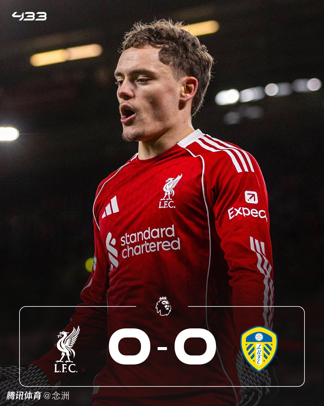 利物浦主场0-0利兹联,联赛3连胜终结。上阿利松失误险送礼,埃基蒂克头球失空门,范戴克头球造险,维尔茨屡失良机,勒温破门无效。