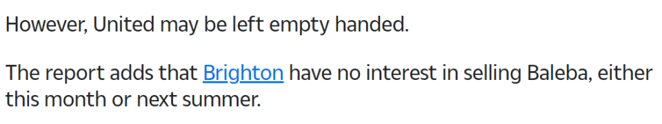 布莱顿认为,曼联之所以接二连三地探寻巴莱巴的转会,属于居心叵测,想要因此动摇球员的专注度,影响他的发挥,从而起到压低价格的效果。红魔希望以低于8000万英镑的价格,从「海鸥军团」得到巴莱巴。