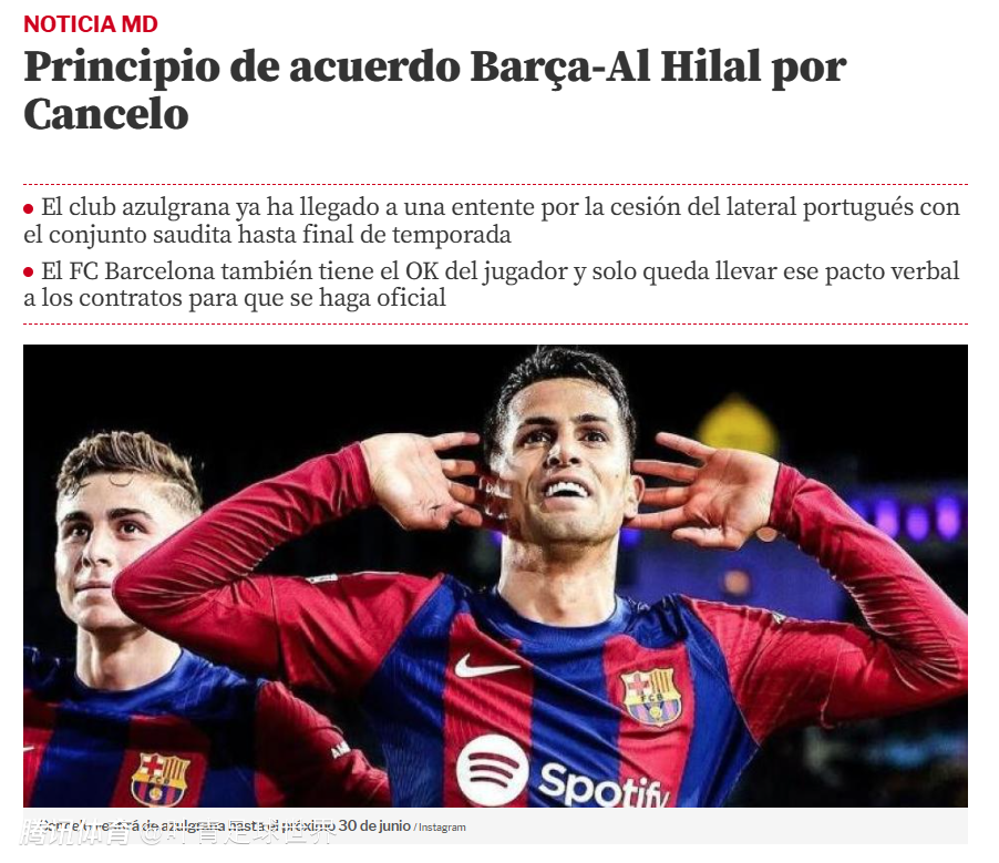 《世界体育报》指出,巴萨已经和利雅得新月打成原则性协议。坎塞洛的750万薪水,巴萨承担500万。由于克里斯滕森重伤,丹麦中卫将被取消注册,薪资空间可以腾出来,差不多可以满足坎塞洛的薪资需求。
