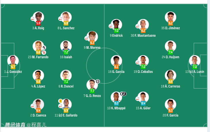 皇马首发:13-卢宁、18-卡雷拉斯、20-弗兰·加西亚、24-赫伊森、35-大卫·希门尼斯、15-居莱尔(77’5-贝林厄姆)、19-塞巴略斯(86’28-塞斯特罗)、9-恩德里克、10-姆巴佩、16-贡萨洛·加西亚(77’14-琼阿梅尼)、30-马斯坦托诺(65’11-罗德里戈)。