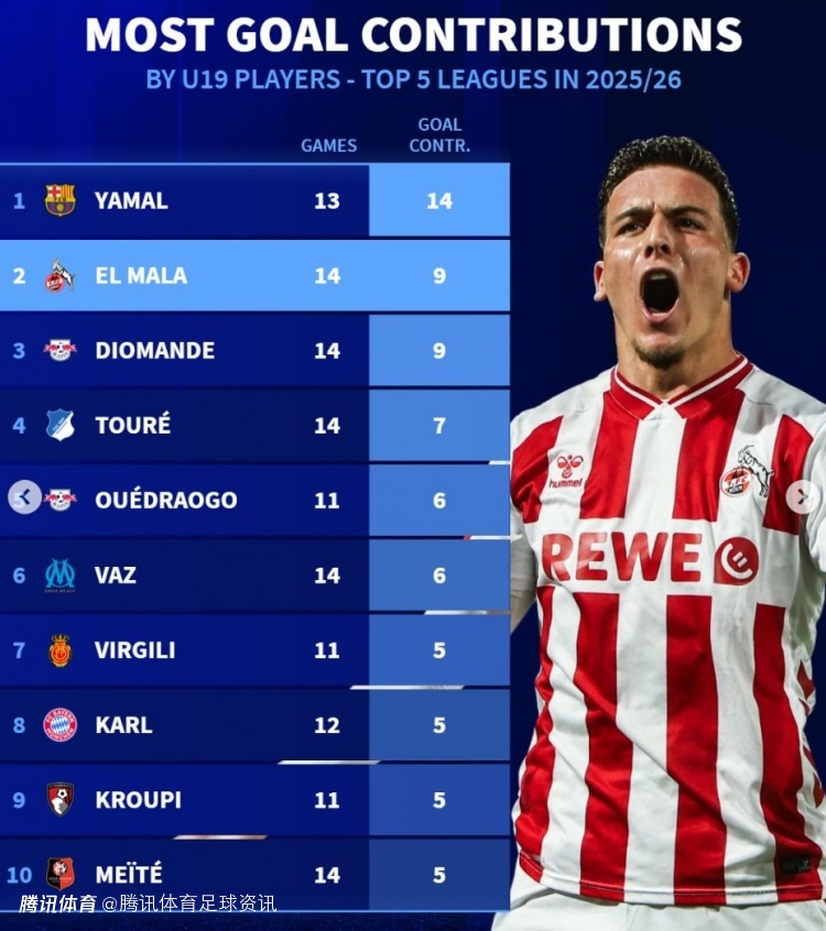 亚马尔本赛季在五大联赛出战13场比赛,直接参与14粒进球,领跑所有U19球员。科隆的萨义德·马拉与莱比锡红牛的扬·迪奥曼德同样出场14次,分别参与9球,分列其后。