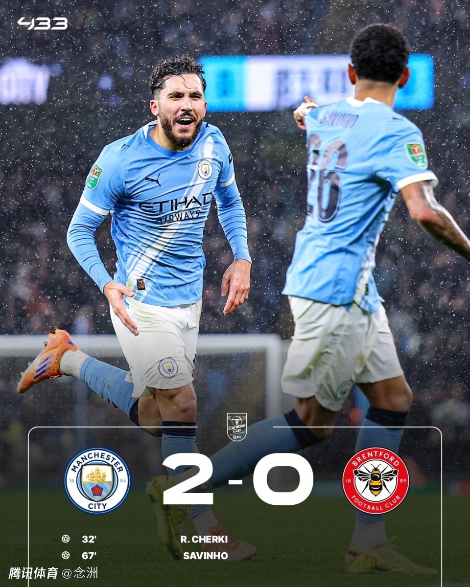 英格兰联赛杯1/4决赛,曼城主场2-0布伦特福德,晋级四强。鲍勃伤退,谢尔基远射首开纪录,萨维尼奥破门锁定胜局。