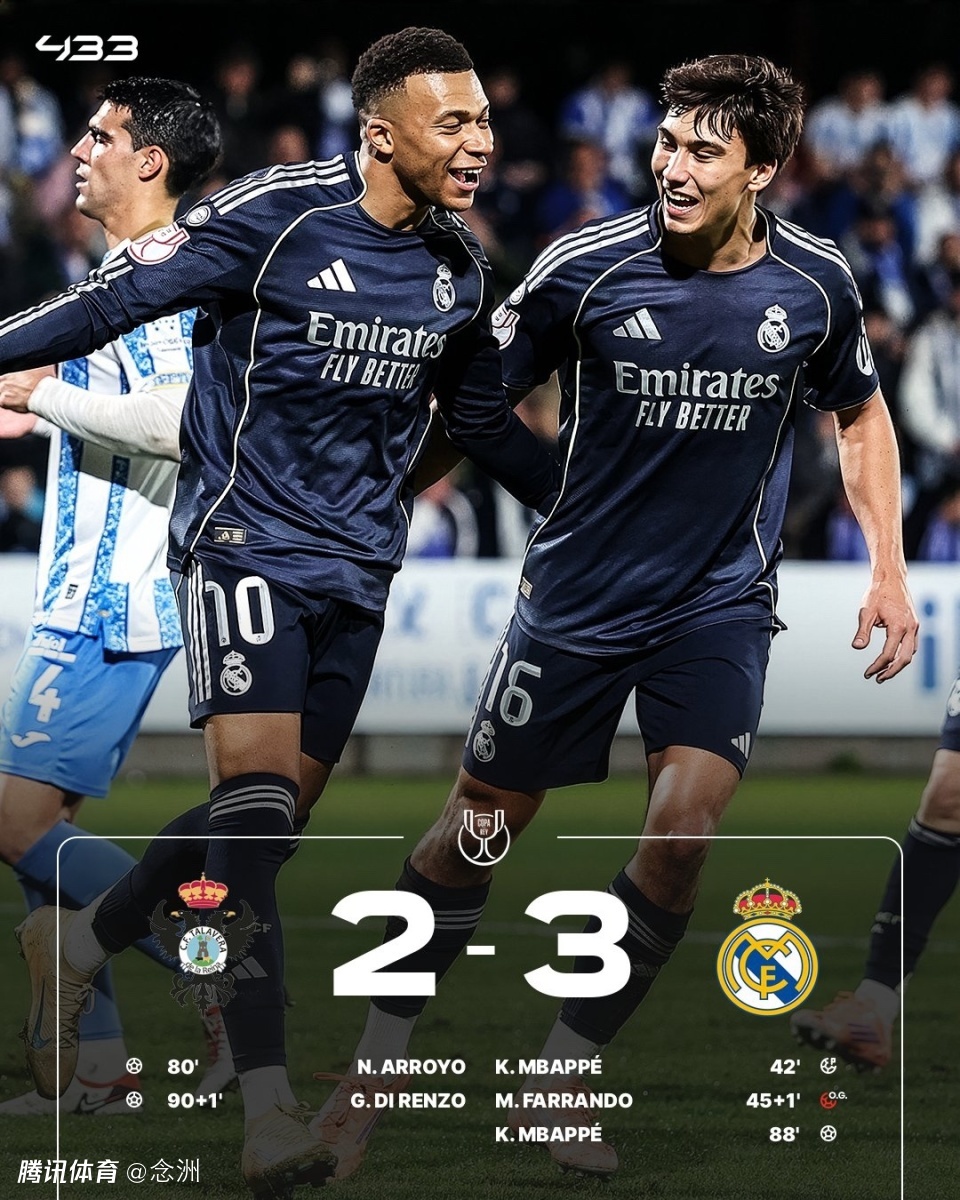 西班牙国王杯1/16决赛,皇马客场3-2西协甲球队塔拉维亚,晋级16强。对方手球送点,姆巴佩点射破门,又造成法兰多自摆乌龙,纳韦尔扳回一球,姆巴佩远射梅开二度,迪伦佐补时破门。