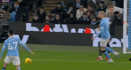 第82分钟,哈兰德禁区左路强行超车,一脚爆射击中边网。