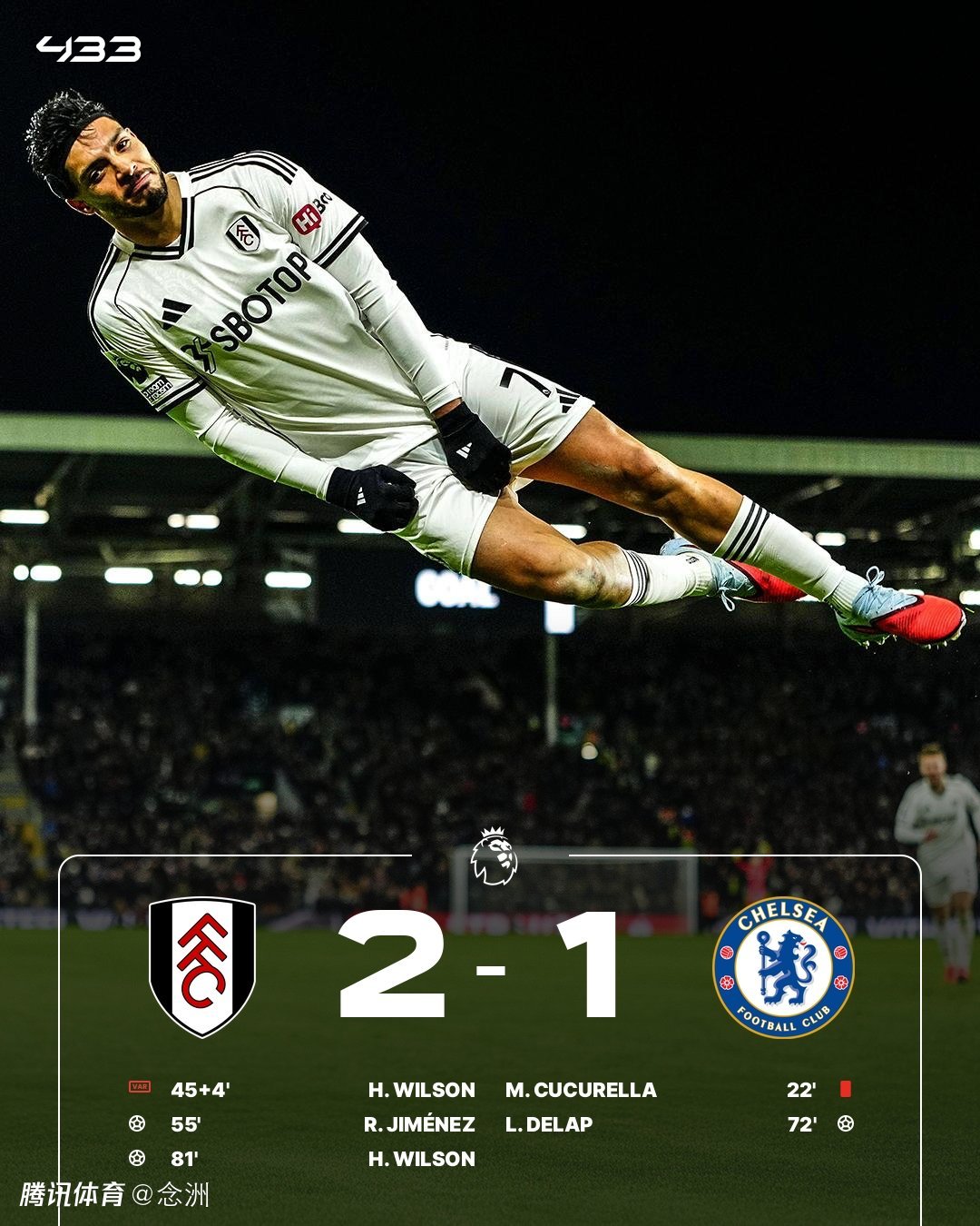切尔西客场1-2富勒姆,英超5轮不胜,被曼联反超降至第6。库库雷利亚直红被罚下,希门尼斯打破僵局,德拉普处子球扳平,威尔逊进球再次领先。
