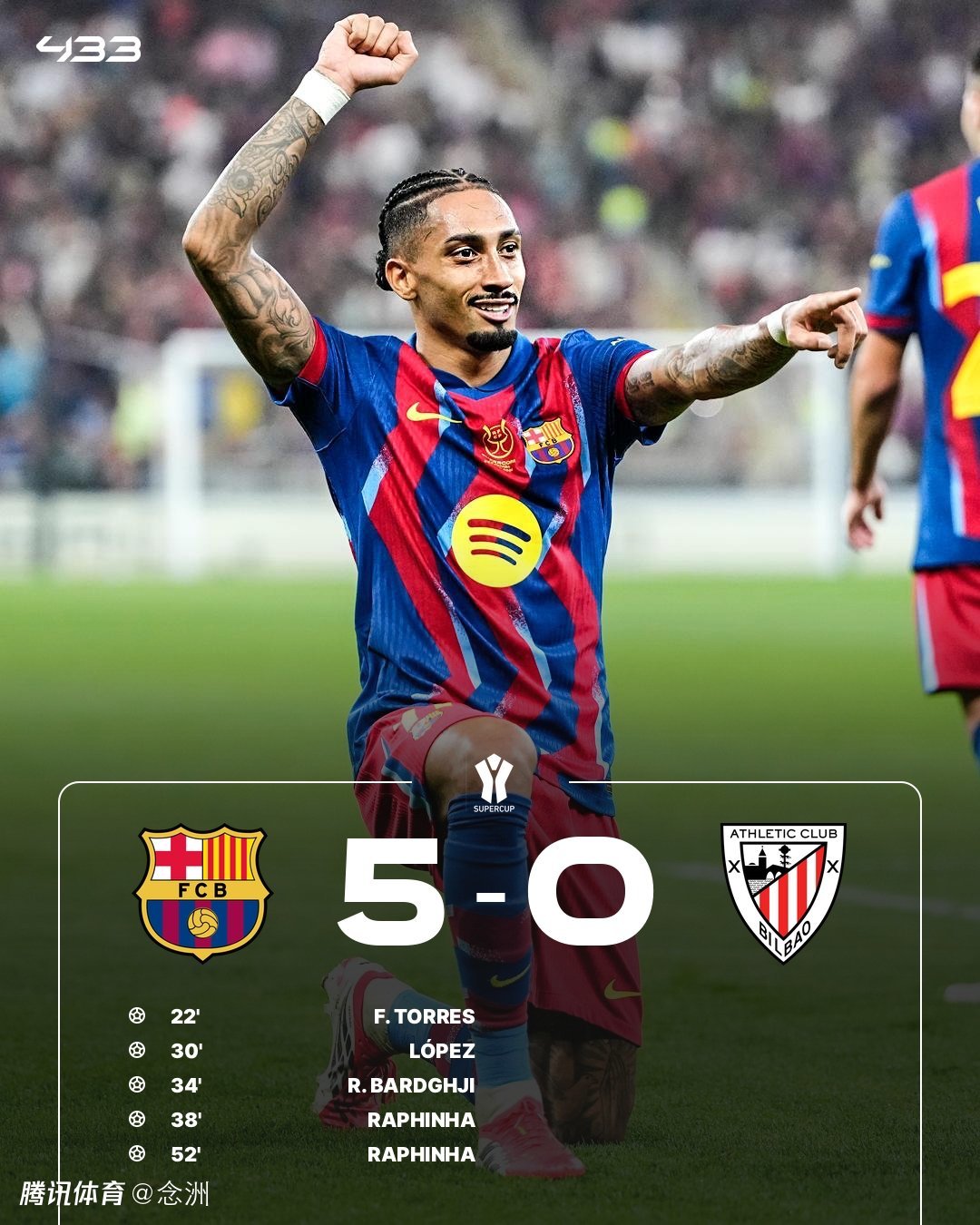 西班牙超级杯半决赛在沙特举行,巴萨5-0大胜毕尔巴鄂竞技晋级决赛,决赛将对阵皇马与马竞之间的胜者。费兰首开纪录,费尔明2传1射,拉菲尼亚和巴德吉均献传射,西蒙送礼,拉菲尼亚再入一球。