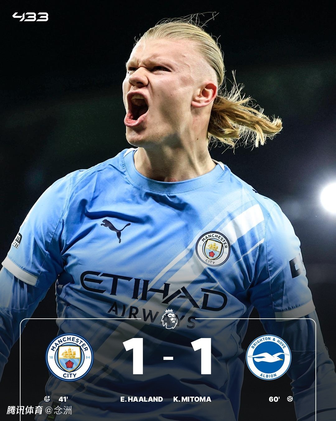 曼城主场1-1战平布莱顿,英超三连平,先赛情况下暂落后榜首阿森纳5分。多库造点,哈兰德点射首开纪录,三笘薰扳平比分,B席射门击中立柱。