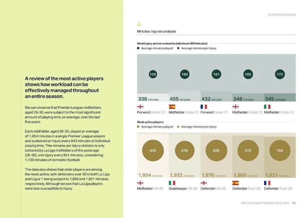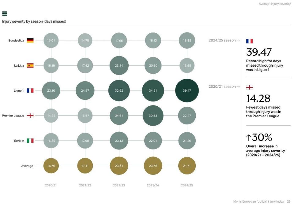 豪顿报告显示过去的5个赛季,五大联赛单赛季平均伤病时间普遍增长。法甲从23.1天飙升到39.47天,形势最严峻。英超从14.28天增至22.47天,2023/24赛季峰值也达到30.63天。究其根源,近5个赛季愈发紧密的赛程和不断增加的比赛是主因。曾与曼联和红牛集团合作过的精英运动员伤病风险专家索普表示:“大赛后的伤病激增符合逻辑,参加国际大赛的球员都是高薪精英球员,他们的伤病会造成俱乐部成绩和经济的巨大损失。”