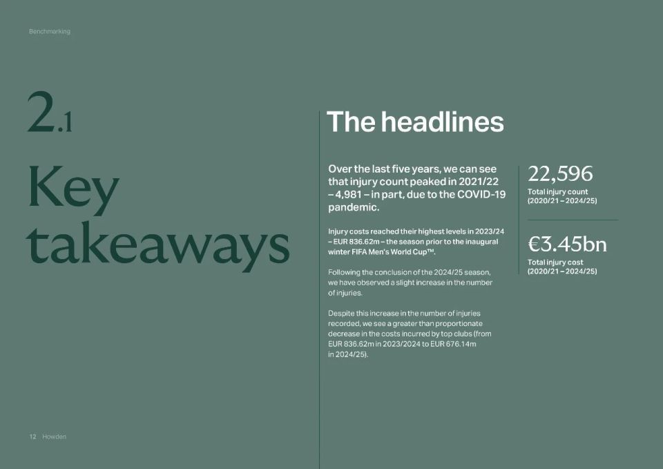 2020年疫情暴发,导致联赛后程被推迟到夏季高密度进行。随后连续经历了2021年欧洲杯,2022年世界杯,2024年欧洲杯和2025年世俱杯。赛程紧密使得大赛后的伤病激增,2022年卡塔尔世界杯中断了欧洲传统赛季,几乎没有增加冬休时间,直接造成伤病人次和成本的上升。2022年12月五大联赛的“伤病成本”为5032万欧元,2023年1月世界杯结束后仅1个月就飙升到7819万,增幅高达55%。