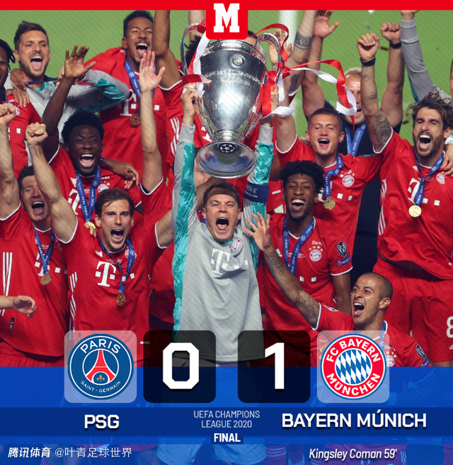同样是2020年,欧冠决赛拜仁vs巴黎圣日耳曼。科曼打进唯一进球,拜仁夺得分量最重的大耳朵杯。