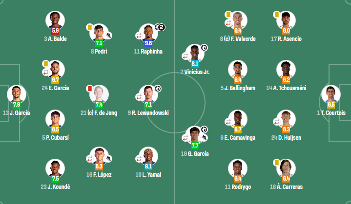 巴塞罗那(4-2-3-1):霍安-加西亚;孔德,库巴西,埃里克-加西亚(83'赫拉德-马丁),巴尔德;德容,佩德里;亚马尔(93'阿劳霍),费尔明(66'奥尔莫),拉菲尼亚(83'拉什福德);莱万多夫斯基(66'费兰-托雷斯)