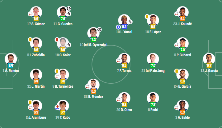 巴塞罗那:霍安-加西亚;孔德(85'巴德吉),库巴西(85'赫拉德-马丁),埃里克-加西亚,巴尔德(62'坎塞洛);费尔明,德容,佩德里;亚马尔,费兰-托雷斯(62'莱万多夫斯基),奥尔莫(62'拉什福德)