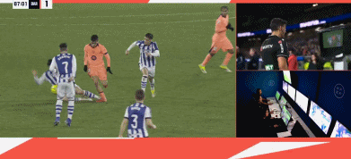 第86分钟,索莱尔铲球踢中佩德里脚踝,主裁观看录像后红牌罚下索莱尔。