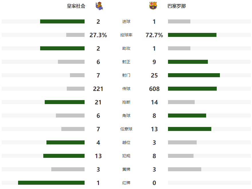 北京时间1月19日凌晨,西甲第20轮中,巴萨客场2-1不敌皇家社会,联赛9连胜告终,仍领先皇马1分领跑。奥亚萨瓦尔闪电战进球,拉什福德破门扳平后1分钟格德斯进球再度助皇社领先,莱万与孔德中柱,费尔明、德容与亚马尔进球被判无效。