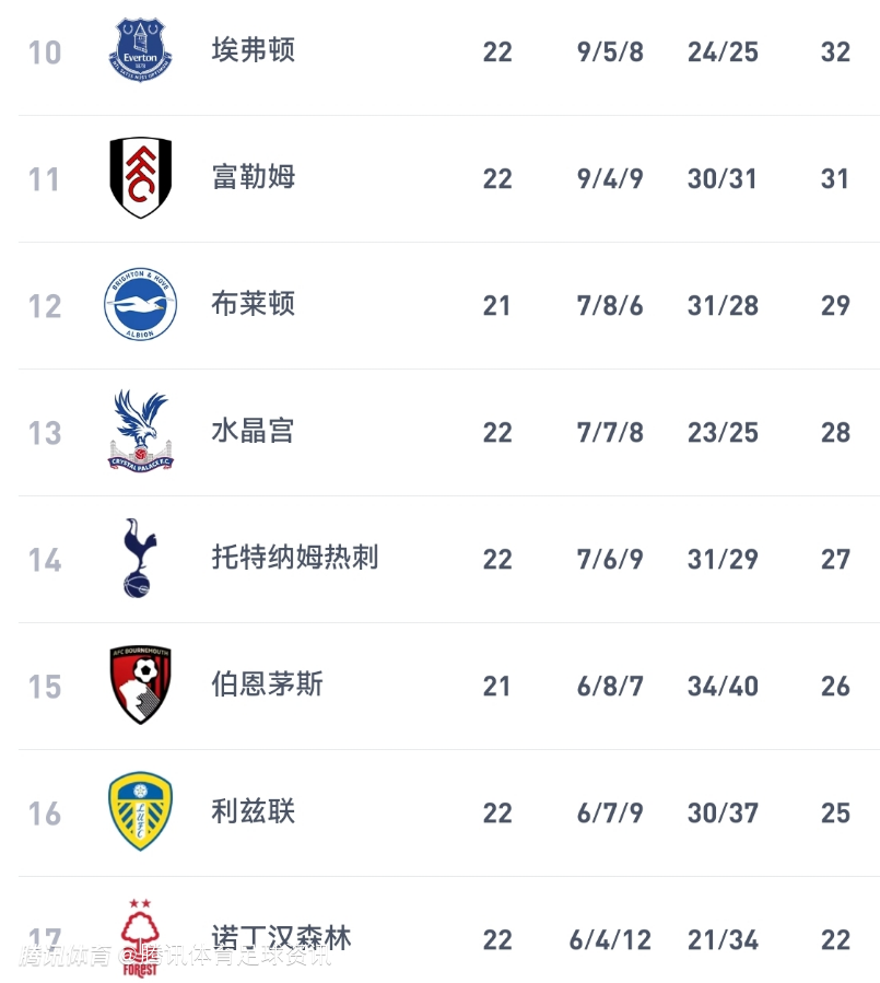 排名第7-17的分别是:布伦特福德(33分)、纽卡(33分)、桑德兰(33分)、埃弗顿(32分)、富勒姆(31分)、布莱顿(29分)、水晶宫(28分)、热刺(27分)、伯恩茅斯(26分)、利兹联(25分)、诺丁汉森林(22分);其中热刺在本轮是2-3被伯恩茅斯决赛,目前仅仅排名第14位。