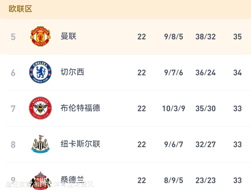 第五名的是刚刚在曼市德比胜出的曼联,他们目前是22轮积35分和利物浦也只有1分的差距了。