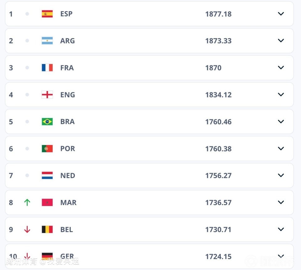而其他足坛强国方面,欧洲杯冠军西班牙和世界杯、美洲杯冠军阿根廷,依然分居世界前2位。