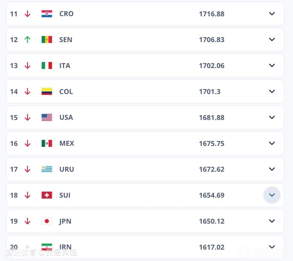 亚洲球队方面,日本下降1位,来到第19位,伊朗第20位,韩国第22位。