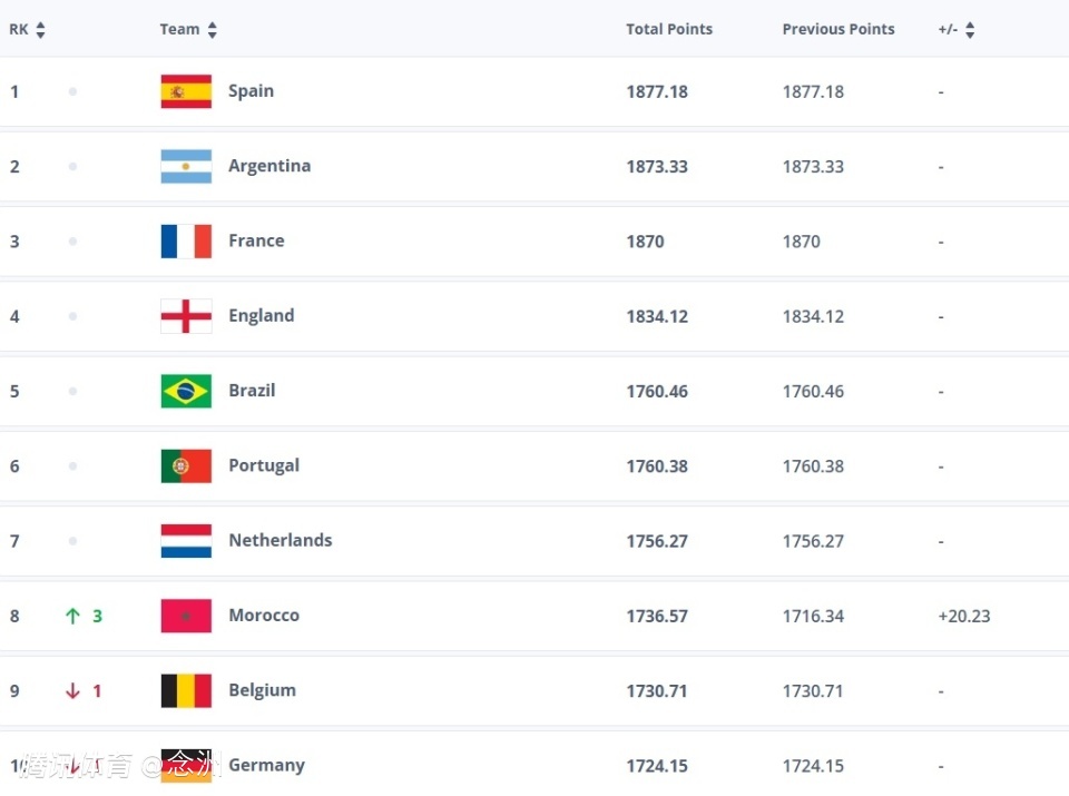 国际足联更新排名,西班牙仍排名世界第一,阿根廷第二,摩洛哥非洲杯夺得亚军,上升3名排在第8,塞内加尔非洲杯夺冠,排名升至第12,上升7名。