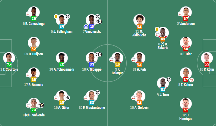 皇家马德里(4-3-3):库尔图瓦;巴尔韦德(83'梅索),劳尔-阿森西奥(46'塞瓦略斯),赫伊森,卡马文加(76'弗兰-加西亚);居莱尔(71'卡瓦哈尔),琼阿梅尼,贝林厄姆;马斯坦托诺(71'冈萨洛-加西亚),姆巴佩,维尼修斯